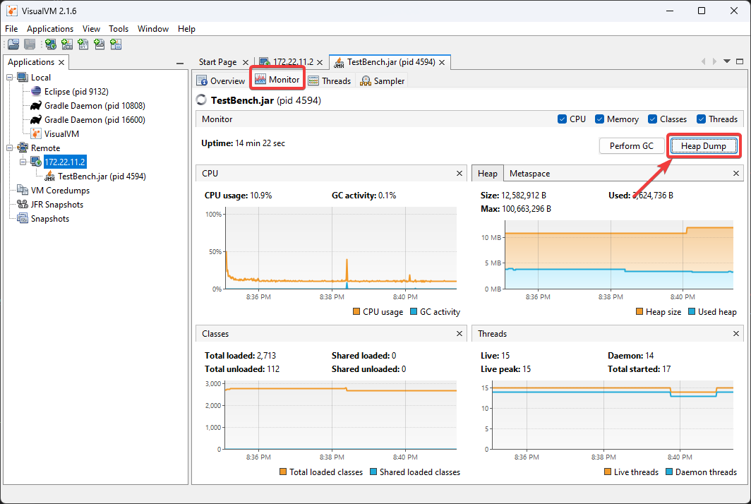 To begin, ensure you are on the Monitor tab and click Heap Dump.