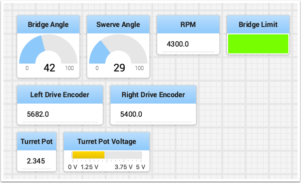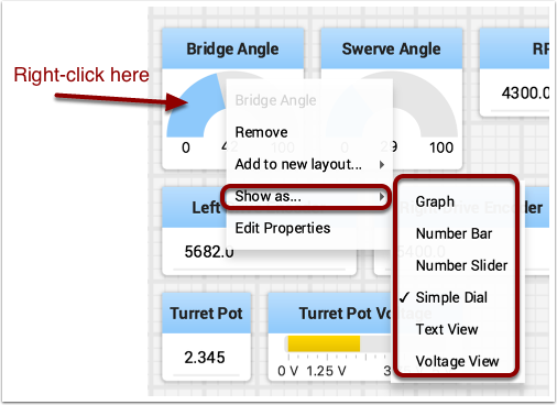 Depending on the data type of the values being sent to Shuffleboard you can often change the display format. In the previous example you can see that number values were displayed as either decimal numbers, a dial to better represent angles, and as a voltage view for the turret potentiometer. To set the display type right-click on the tile and select “Show as…”. You can choose display types from the list in the popup menu.