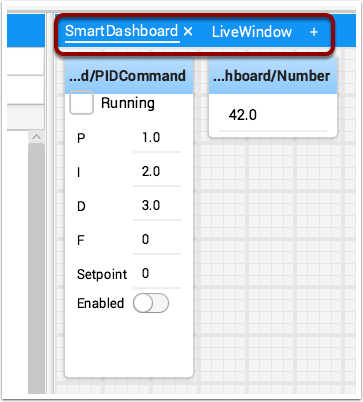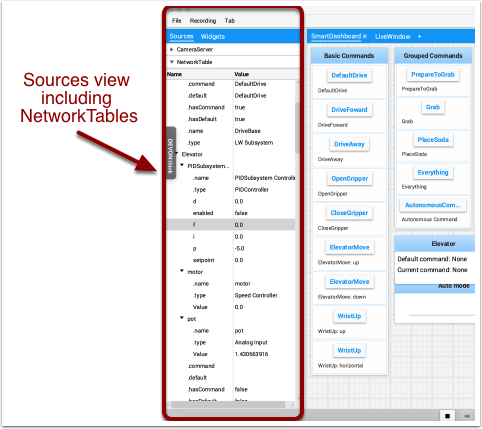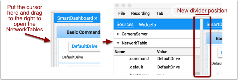 Normally NetworkTables data automatically appears on one of the tabs and you just rearrange and use that data. Sometimes you might want to recover a value that was accidentally deleted from the tab or display a value that is not part of the SmartDashboard / NetworkTables key. For these cases the values can be dragged onto a pane from NetworkTables view under Sources on the left side of the window. Choose the value that you want to display and just drag it to the pane and it will be automatically created with the default type of widget for the data type.