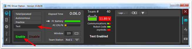 You may add code to your program to display values for your sensors and actuators while the robot is in Test mode. This can be selected from the Driver Station whenever the robot is not on the field. The code to display these values is automatically generated by RobotBuilder or manually added to your program and is described in the next article. Test mode is designed to verify the correct operation of the sensors and actuators on a robot. In addition it can be used for obtaining setpoints from sensors such as potentiometers and for tuning PID loops in your code.