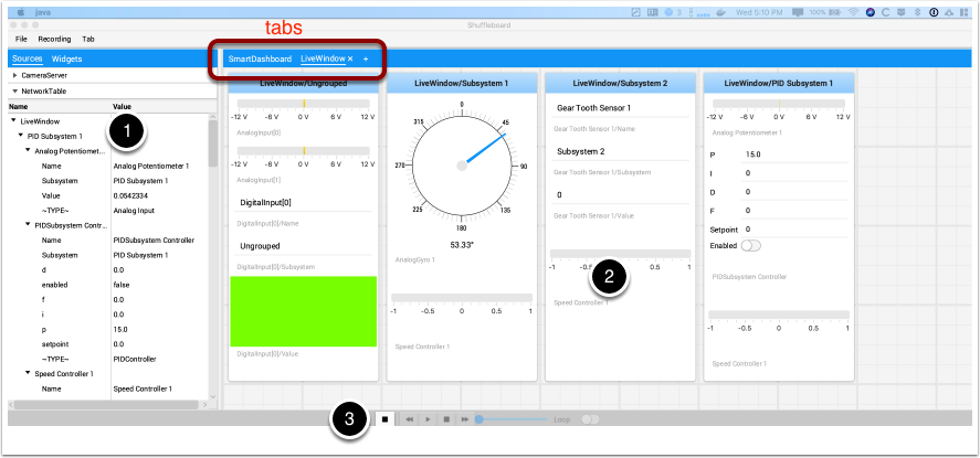 Tab panes: This is where you data is displayed from the robot or other sources. In this example it is Test-mode subsystems that are shown here in the LiveWindow tab. This area can show any number of tabbed windows, and each window has it’s own set of properties like grid size and auto-populate.