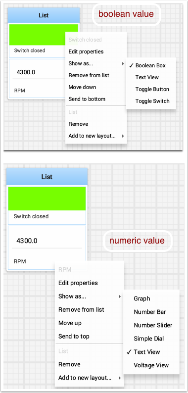 Shuffleboard is very rich in display types depending on the data published from the robot. It will automatically choose a default display type, but you might want to change it depending on the application. To see what the possible displays are for any widget, right-click on the widget and select the “Show as…” and from the popup menu, choose the desired type. In the example below are two data values, one a number and the other a boolean. You can see the different types of display options that are available to each. The boolean value has only two possible values (true/false) it can be shown as a boolean box (the red/green color), or text, or a toggle button or toggle switch. The. number value can be displayed as a graph, number bar, number slider, dial, text, or a voltage view depending on the context of the value.