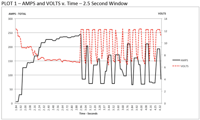 Establish the max “sustained” current draw (with sustained being loosely defined here as not momentary). This is probably the most difficult part of creating the power budget. The exact current draw a battery can sustain while maintaining a voltage of 7+ volts is dependent on a variety of factors such as battery health (see this article for measuring battery health) and state of charge. As shown in the NP18-12 data sheet, the terminal voltage chart gets very steep as state of charge decreases, especially as current draw increases. This datasheet shows that at 3CA continuous load (54A) a brand new battery can be continuously run for over 6 minutes while maintaining a terminal voltage of over 7V. As shown in the image above (used with permission from Team 234s Drive System Testing document), even with a fresh battery, drawing 240A for more than a second or two is likely to cause an issue. This gives us some bounds on setting our sustained current draw. For the purposes of this exercise, we’ll set our limit at 180A.