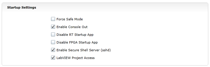 Force Safe Mode - Forces the controller into Safe Mode. This can be used with troubleshooting imaging issues, but it is recommended to use the Reset button on the roboRIO to put the device into Safe Mode instead (with power already applied, hold the rest button for 5 seconds). Default is unchecked.
