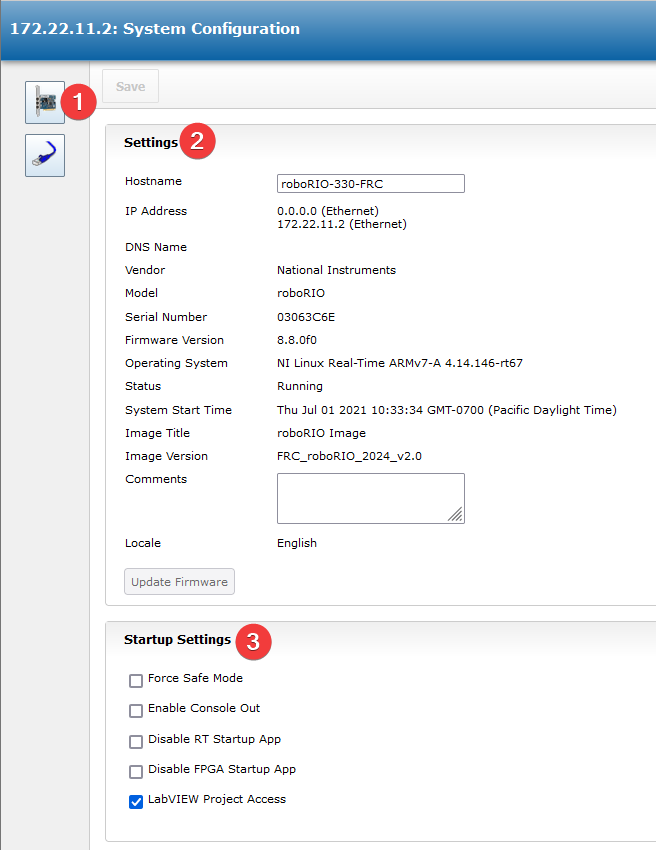 System Settings - This section contains information about the System Settings. The Hostname field should not be modified manually, instead use the roboRIO Imaging tool to set the Hostname based on your team number. This section contains information such as the device IP, firmware version and image version.